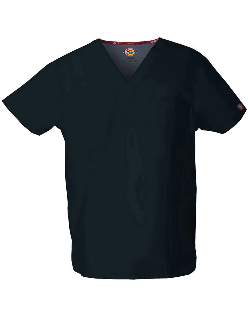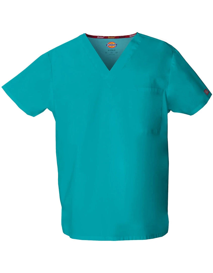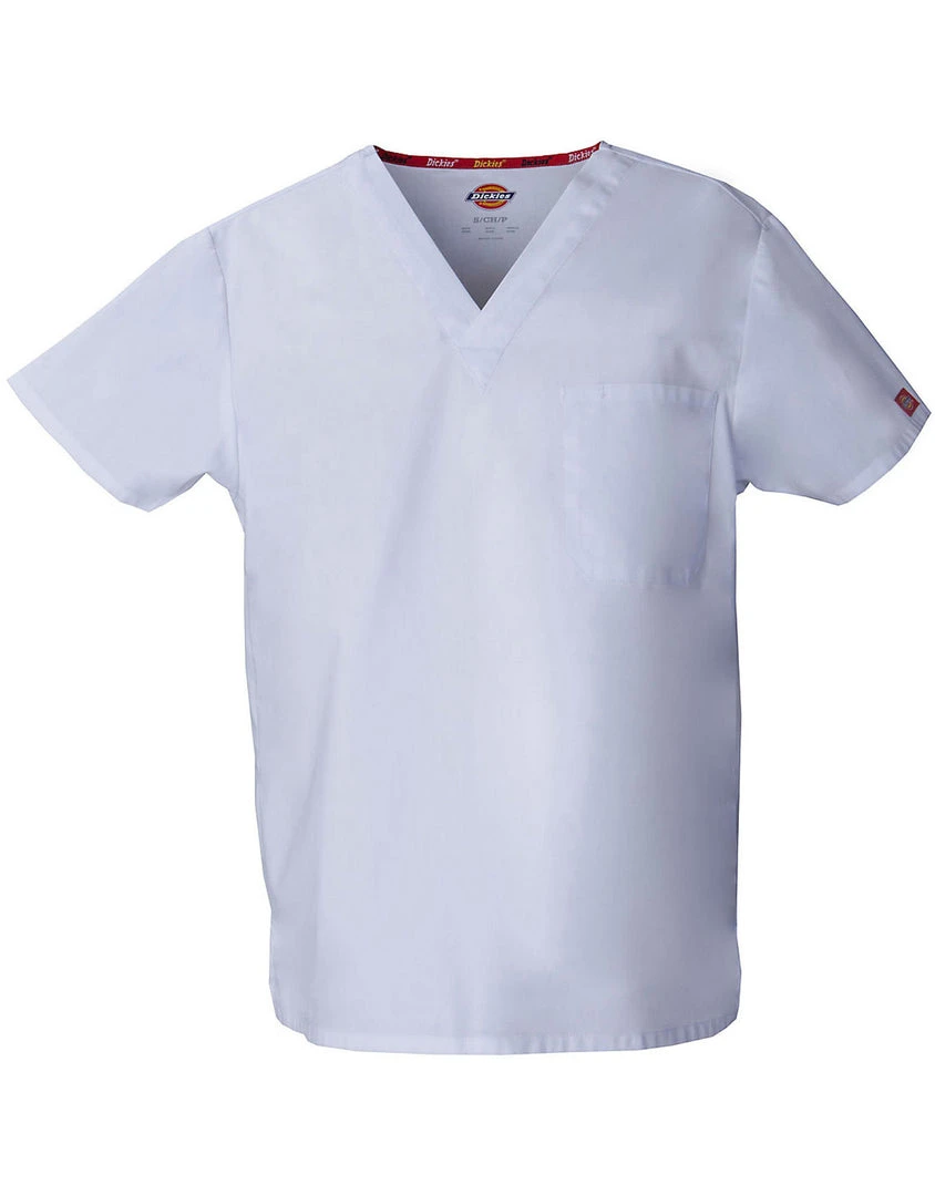 A Unisex V-neck top features Dickies logo twill tape at the back neck, a front chest pocket with a bartacked pencil slot and side vents. Center back length: 28″