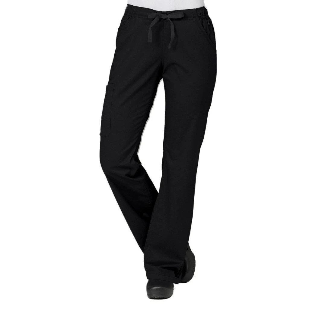 Ladies straight leg with 2/3 elastic waist. Two front slash pockets and inner cell pocket. Two back patch pockets with slim piping. Back yoke. One cargo pocket with multi-function pen pocket. Dyed-to-match drawstring and D-ring loop. Side vents.